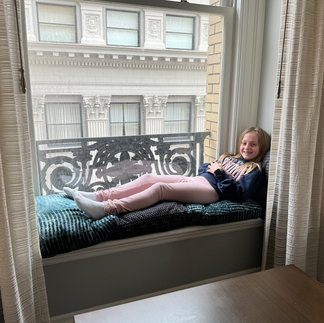 There was plenty of floor space for our four large bags and four carry-ons—I admit, I might be an over-packer! My daughter, Izabel, quickly discovered the coziest little nook, transforming the window ledge into an adorable reading spot with couch pillows. The room even boasted a massive full-size table, which was perfect for working, eating, coloring...and we were frequently treated to fresh fruit, snacks, little notes and water delivered to our room.